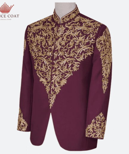 Maroon Customized Embroidered Fabric Pakistani Prince Coat For Men
